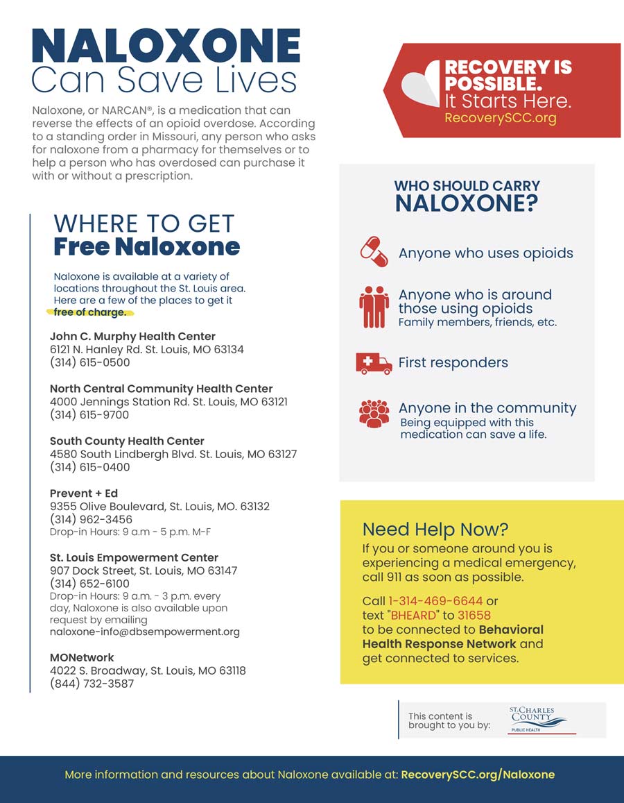 Most recently, Naloxone, a drug that reduces the effects of an overdose, has been made available over the counter in Missouri. Our team developed a series of collateral to share details about overdoses and how to administer Naloxone. The Recovery SCC team will distribute these at community events and inside the bags that Naloxone comes in. Training on how to administer naloxone is becoming a part of CPR training.
